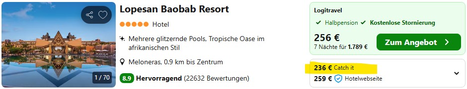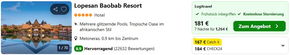Wenn euch die getrennte Buchung von Flügen und Hotel zu umständlich oder unsicher ist, bekommt ihr das Resort auch als Paket mit Flügen und Transfer als klassische Pauschalreise zu guten Preisen. In unserer Reisesuche findet ihr die Angebote aller Veranstalter mit bequemer Filter- und Sortierfunktion.