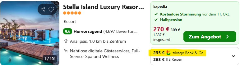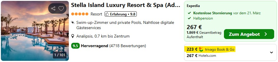 Alternativ könnt ihr das Stella Island natürlich auch als Pauschalreise buchen, also inklusive Flügen und Transfers im Paket. Dann müsst ihr euch um nichts weiter kümmern als rechtzeitig am Flughafen zu sein und habt das deutsche Verbraucherschutzrecht bei Problemen im Rücken.