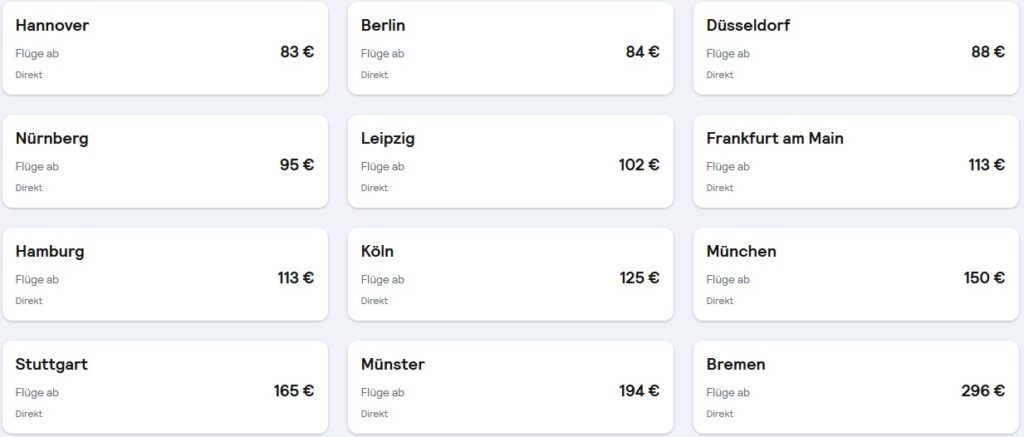 Am besten nutzt ihr eine flexible Suche wie die von Skyscanner, bei der ihr euch zu Recherchebeginn noch nicht auf einen Abflughafen oder exakten Termin festlegen müsst, sondern eine komplette Übersicht bekommt.