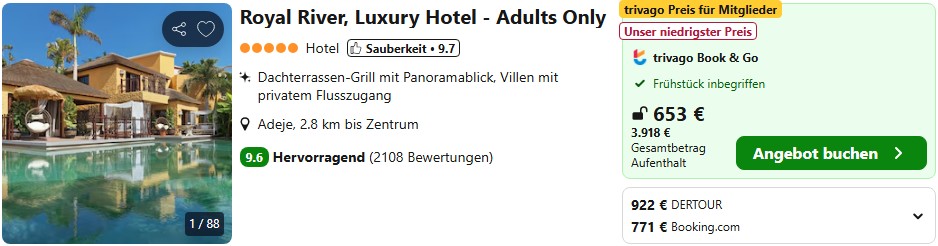 Alternativ könnt ihr das Royal River Resort natürlich auch als Pauschalreise buchen, also inklusive Flügen und Transfers im Paket. Dann müsst ihr euch um nichts weiter kümmern als rechtzeitig am Flughafen zu sein und habt das deutsche Verbraucherschutzrecht bei Problemen im Rücken.
