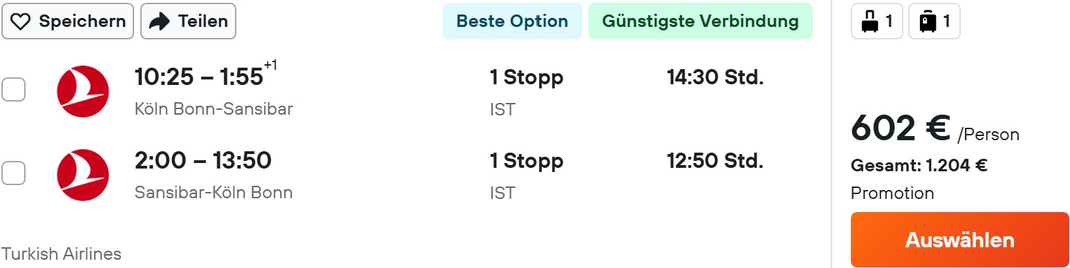 Neben dem ohnehin schon sehr günstigen Preis bietet Turkish Airlines einen weiteren großen Vorteil: das Aufgabegepäck ist selbst bei Promo-Tarifen wie hier schon enthalten. Das spart euch zwischen 100 und 150 Euro, die die meisten anderen Fluggesellschaften inzwischen dafür kassieren.