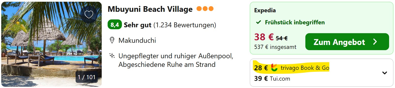 Super günstig könnt ihr im Zeitraum der Flüge das Mbuyuni Beach Village buchen. Es liegt an der Ostküste direkt am Strand und es gibt einen schönen Pool. Heraus ragt der Preis von unter 200€ pro Person für 14 Nächte. Zumal das Frühstück schon dabei ist. Das spielt es auch keine Rolle, dass ihr vom Anreise- und Abreisetag aufgrund der Flugzeiten nicht viel habt.