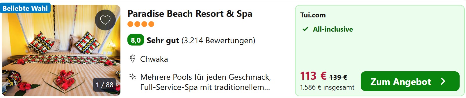 Natürlich könnt ihr euren All Inclusive-Badeurlaub auf Sansibar auch ganz unkompliziert als Pauschalreise buchen. Das kostet etwas mehr, dafür ist alles in einer Buchung enthalten und ihr müsst euch um nichts kümmern. In unserem Preisvergleich findet ihr alle wichtigen Veranstalter und könnt bequem nach eurem Reisezeitraum und Abflughäfen filtern.
