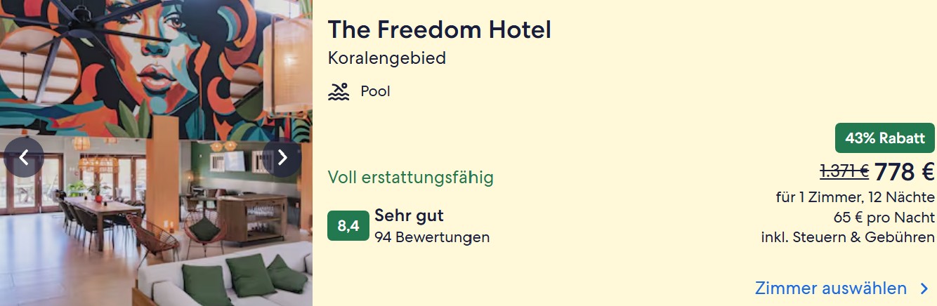 Das Freedom Hotel bietet im Zeitraum der Flüge das beste Preis-Leistungsverhältnis. Es bekommen überall gute Bewertungen, haben einfache, aber saubere Zimmer und einen Pool. 12 Nächte bekommt ihr hier für 389€ pro Person im Doppelzimmer.