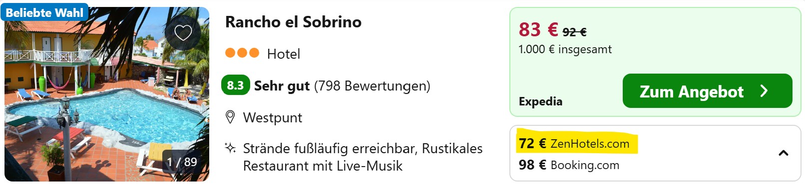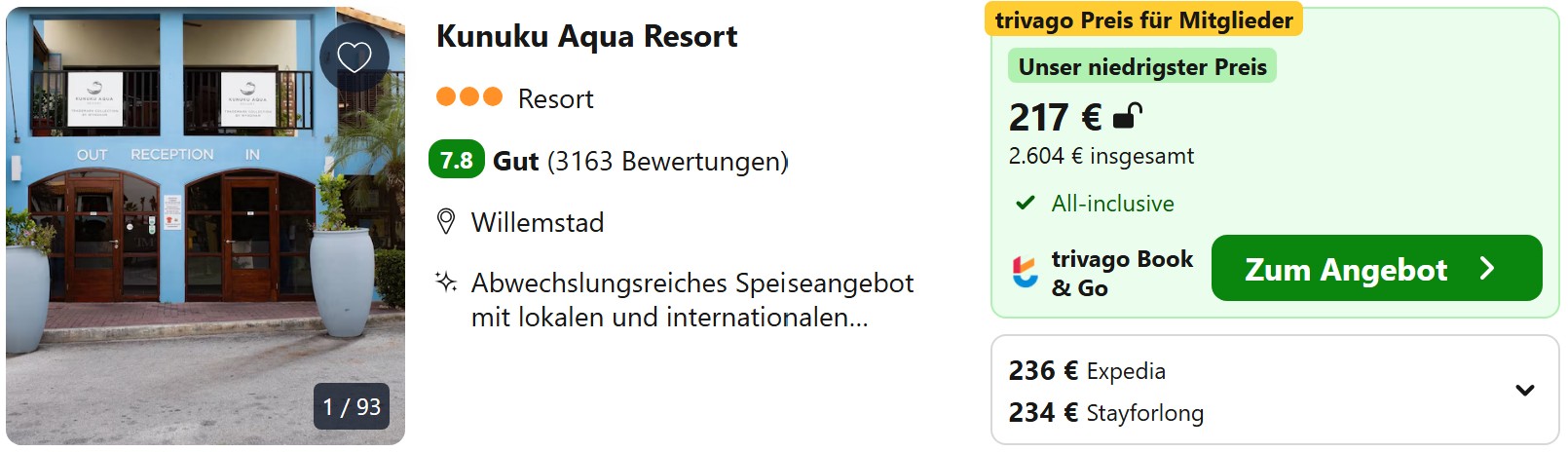 Bucht ihr die Flüge aus unserem Beispiel und sucht euch dazu ein einfaches, aber sehr gut bewertetes Hotel in Willemstad wie unsere Empfehlung unten, bekommt ihr 12 Tage Badeurlaub auf Curacao schon für 909€ pro Person zu zweit. All Inclusive bekommt ihr für etwa 900€ mehr auch.