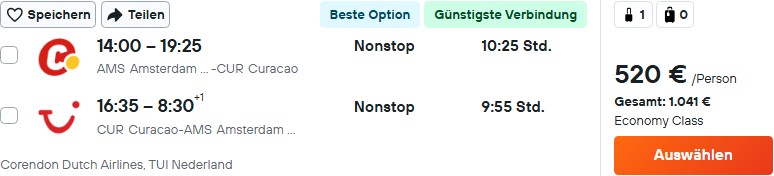Flüge auf die ABC-Inseln, zu denen neben Aruba und Bonaire auch Curacao gehört, sind traditionell teuer. Zumindest wenn ihr von deutschen Abflughäfen startet. Anders sieht es von Amsterdam aus. Dort konkurrieren mit KLM, TUIfly und Corendon gleich drei Fluggesellschaften. Und die Preise sind gleich um einige hundert Euro günstiger.