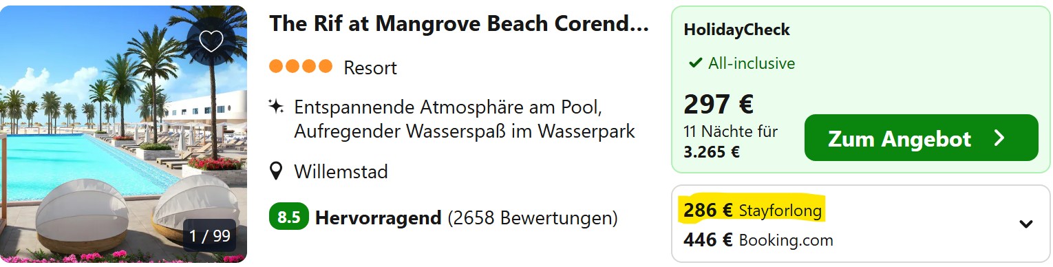 Bucht ihr die Flüge aus unserem Beispiel und sucht euch dazu ein einfaches, aber sehr gut bewertetes Hotel in Willemstad wie unsere Empfehlung unten, bekommt ihr 11 Tage Badeurlaub auf Curacao schon für 749€ pro Person zu zweit. All Inclusive bekommt ihr für etwa 700€ mehr auch.