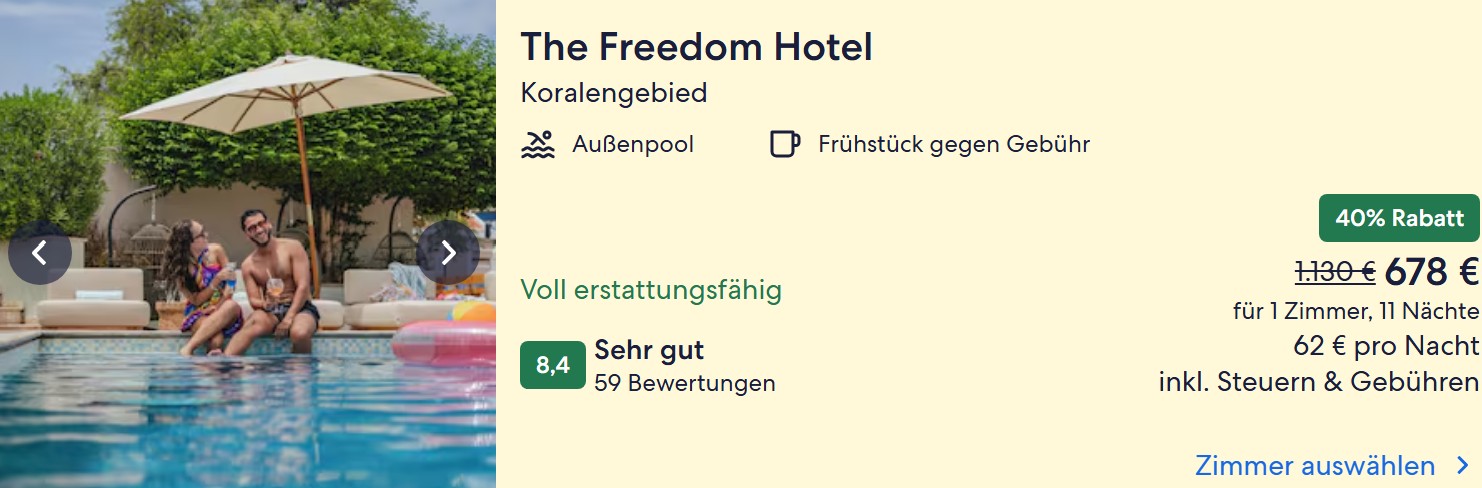 Das Freedom Hotel bietet im Zeitraum der Flüge das beste Preis-Leistungsverhältnis. Es bekommt überall sehr gute Bewertungen, hat einfache, aber saubere Zimmer und einen Pool. 11 Nächte bekommt ihr hier für 339€ pro Person im Doppelzimmer.