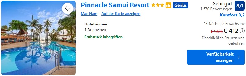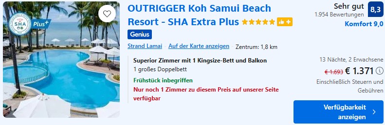 Koh Samui ist nach wie vor sehr günstig. Selbst für ein sehr gut bewertetes Hotel am Strand wie das Pinnacle Samui Resort zahlt ihr mit Frühstück unter 20€ pro Person. Eine weitere Empfehlung mit super Preis-Leistungsverhältnis ist das 5* Outrigger Koh Samui Beach Resort. Mit Frühstück kosten euch dort 13 Nächte nur 685€ pro Person