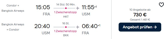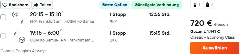 Jetzt schließt sich jedoch der Kreis: Denn auch Condor hat ein Abkommen mit Bangkok Airways, so dass ihr Flüge von Frankfurt über Bangkok nach Koh Samui auf ein Ticket buchen könnt. Und es wird noch besser: Denn durch diese so genannte Codeshare-Verbindung ändert sich der Basis-Tarif von Condor dahingehend, dass ihr selbst beim günstigsten Preis schon Aufgabegepäck inklusive habt.