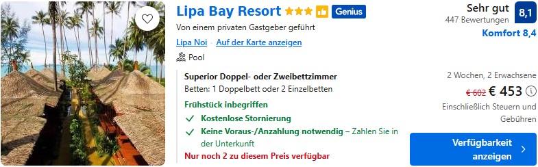 Passend zu den günstigen Flügen haben wir auch noch zwei äußerst spannende Hotelempfehlungen für euch. Beides sehr gut bewertete Resorts mit Poll und Frühstück nicht weit vom bzw. direkt am Strand. Insgesamt kommt ihr so auf nur 959€ für einen 15-tägigen Badeurlaub auf Koh Samui.