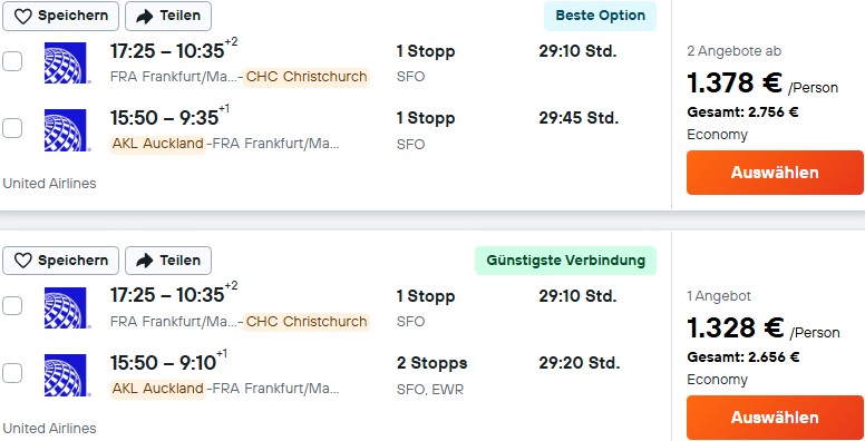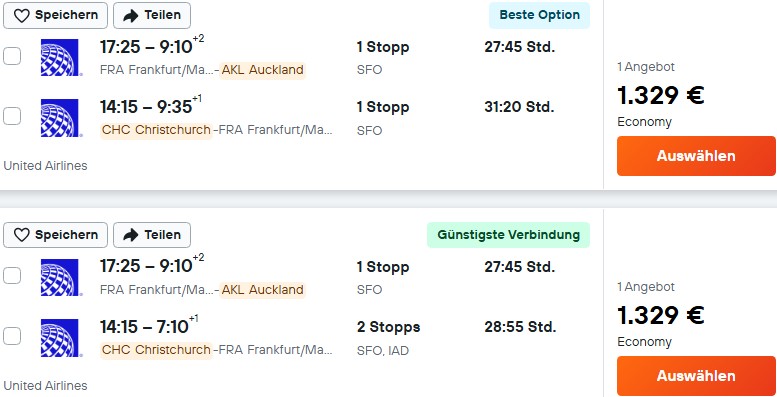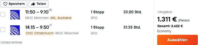 Zwei Beispiele von Frankfurt und München als Gabelflug, also hinzu nach Auckland auf der Nordinsel und zurück von Christchurch auf der Südinsel, findet ihr unten. Es funktionieren aber zum gleichen Preis auch klassische Hin- und Rückflüge nur nach Auckland oder nur nach Christchurch, wenn ihr euch auf eine der Inseln beschränken wollt.