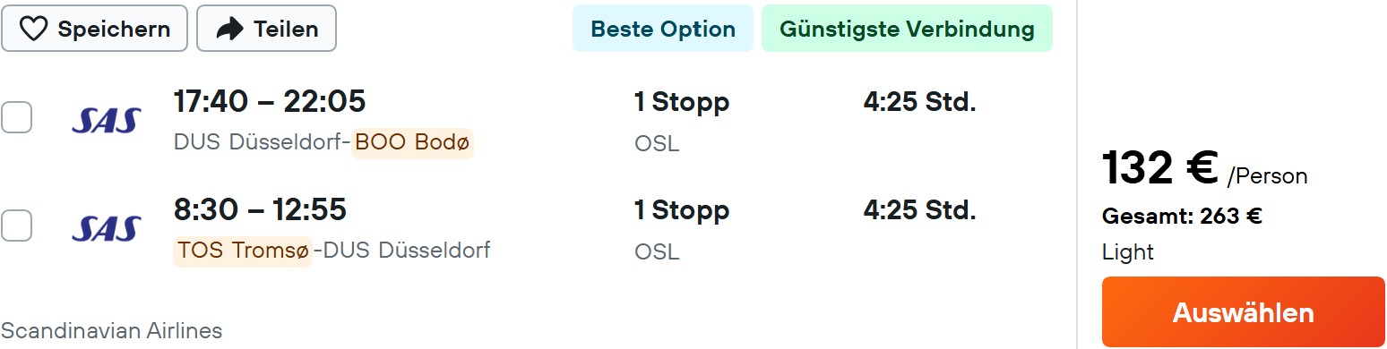Super günstig bekommt ihr momentan Umsteigeverbindungen mit SAS von Düsseldorf über Oslo zu verschiedenen Regionalflughäfen in Norwegen, unter anderem Bodø und Tromsø. Hin- und Rückflug lassen sich gabeln, was perfekt für eine Rundreise wie diese ist.