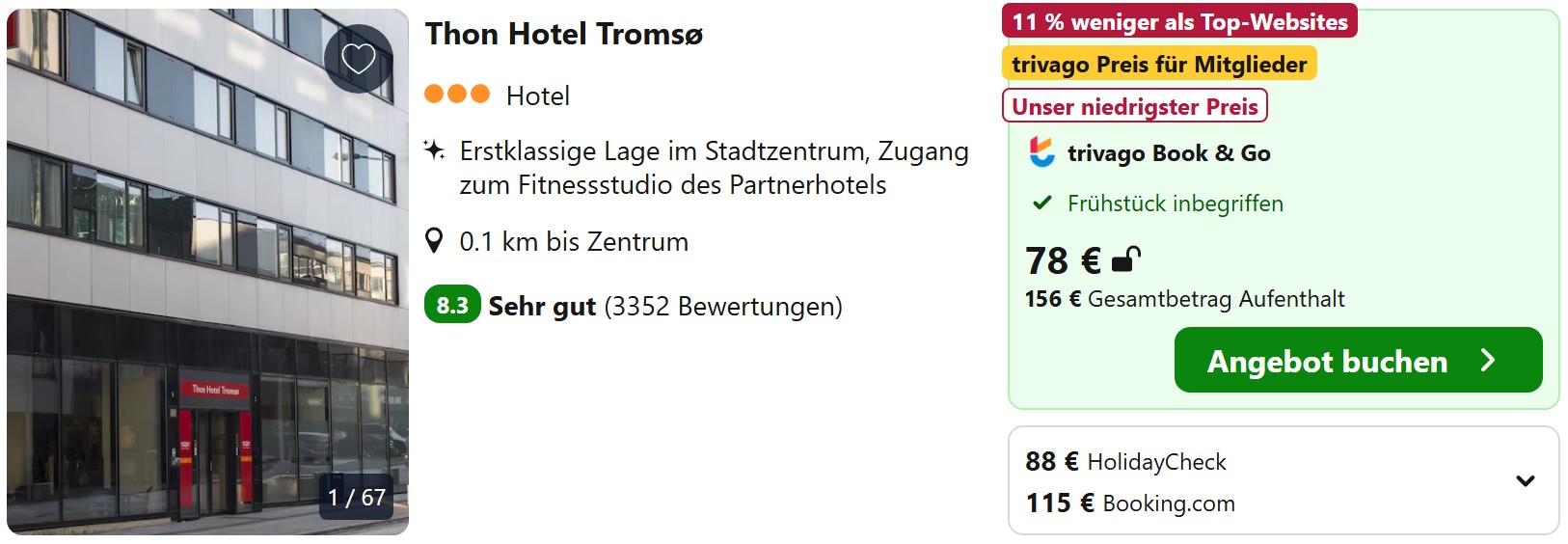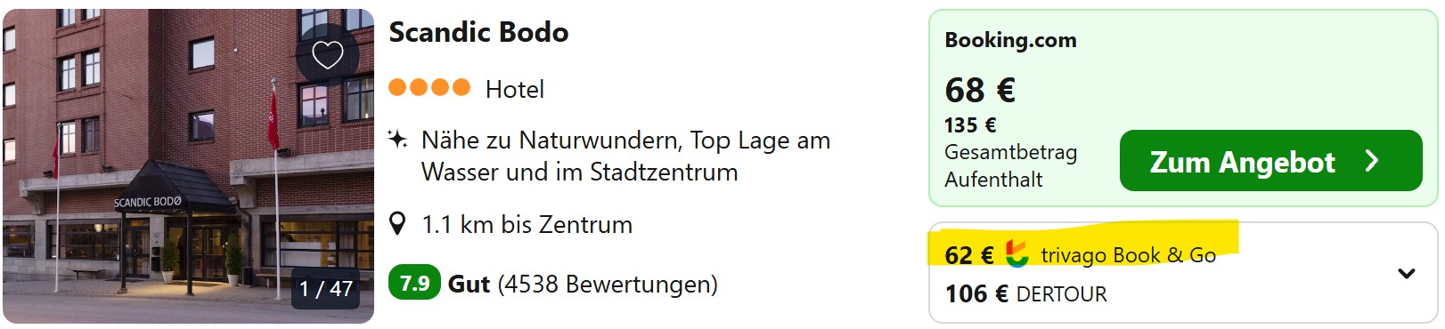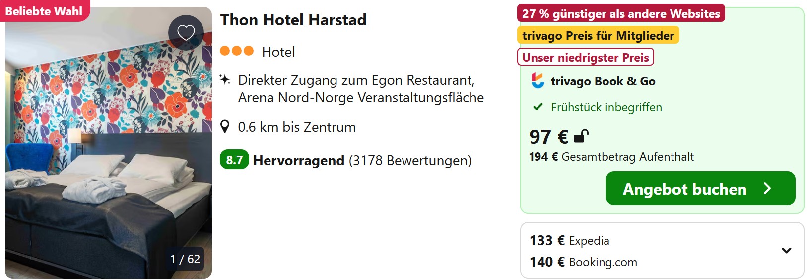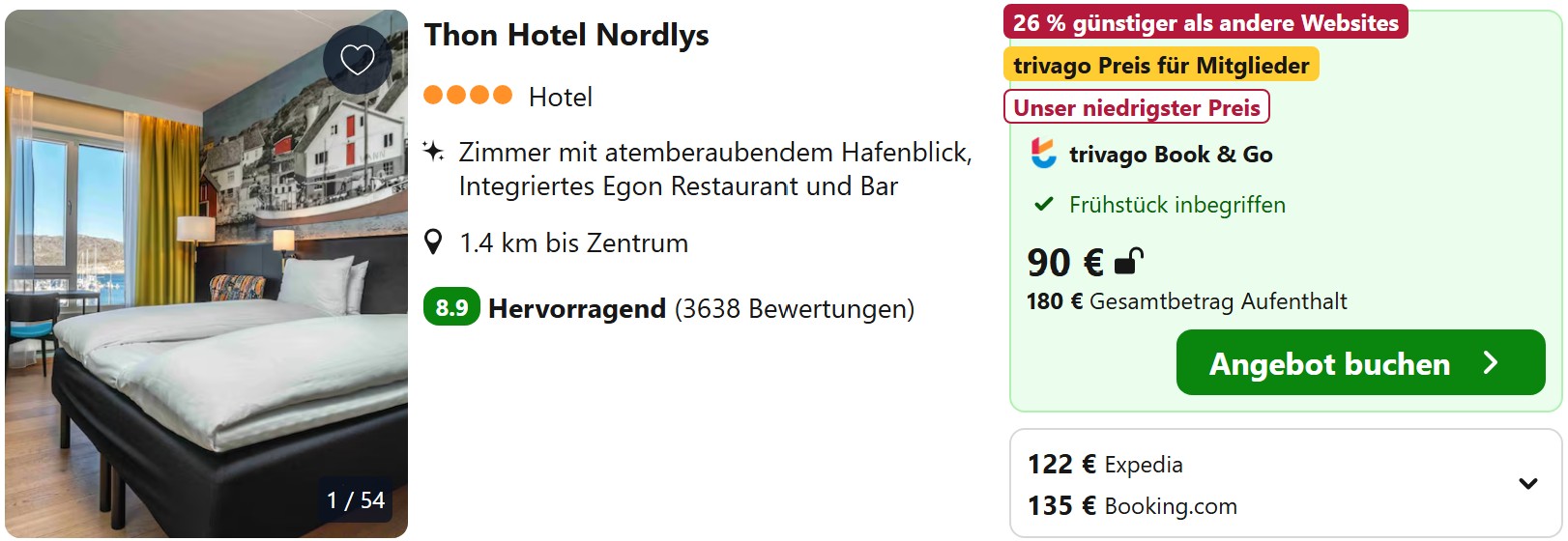 In Bodø und Tromsø, wo die Zahl der Unterkünfte in den letzten Jahren getrieben vom Nordlicht-Tourismus enorm nach oben geschnellt ist, findet ihr sogar Mittelklassehotels im Bereich 50 bis 60 Euro.
