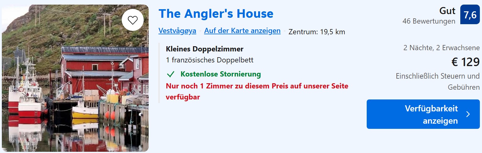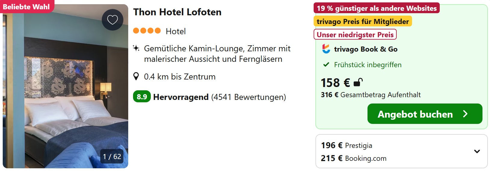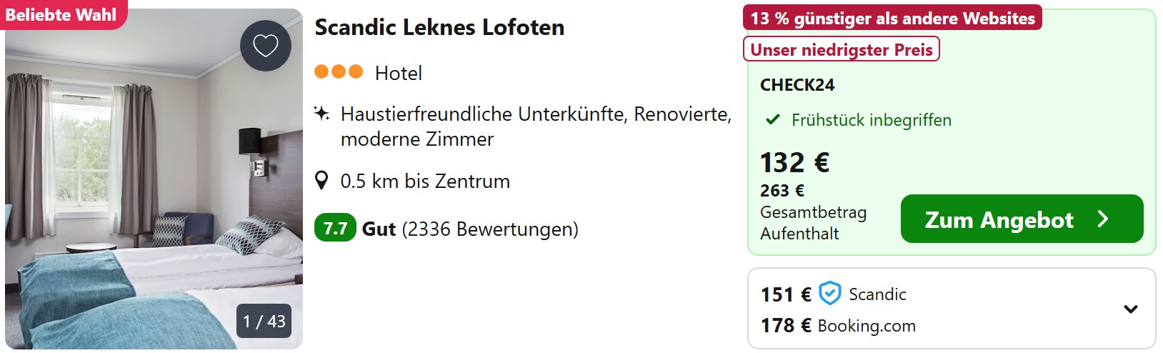 Unterkünfte in Norwegen sind nach wie vor teuer, vor allem in den kleinen Orten auf den Lofoten, wo das Angebot noch längst nicht auf die gestiegene Nachfrage der letzten Jahre angepasst wurde. Dennoch lassen sich bei frühzeitiger Buchung überall noch einfache Hotelzimmer oder Apartments für unter 100€ pro Nacht für 2 Erwachsene finden.