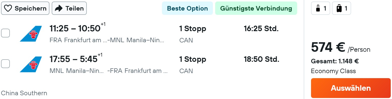 Aktuell geht es aber wieder erstaunlich günstig schon ab 574€ nach Manila. Start ist in Frankfurt und ihr fliegt mit China Southern und einem kurzen Umstieg in Guangzhou. Dort hat die chinesische Fluggesellschaft ihren Hauptsitz. Sie gehört zur Kooperation „Skyteam“ und bekommt beim Bewertungsportal Skytrax genauso wie Lufthansa 4 von 5 Sternen.