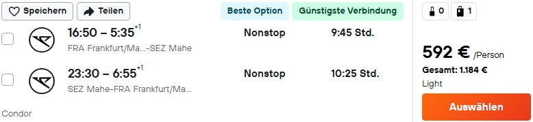Wenn ihr die paradiesische Inselgruppe der Seychellen besuchen wollt, haben wir für euch super günstige Flüge als Frühbucherangebot. Im Winter 2025/26 könnt ihr schon ab 529€ nonstop mit Condor von Frankfurt nach Mahé, der Hauptstadtinsel, fliegen.