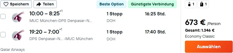 Günstige Flüge nach Bali sind auch 2026 wieder äußerst rar. Unter 1000€ werdet ihr für die Trockenzeit von Mai bis September nur mit viel Mühe Angebote mit guten Flugzeiten, maximal einem Umstieg und Aufgabegepäck inklusive finden.
