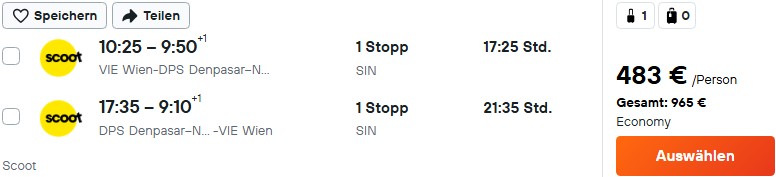 Etwas besser sieht es aus, wenn Wien für euch als Abflughafen in Frage kommt. Denn mit dem Billigflieger Scoot geht es schon für unter 500€ und einem Umstieg in Singapur nach Indonesien. Auch wenn ihr als Nicht-Backpacker dann sicher noch den einen oder anderen Euro für Aufgabegepäck investieren müsst.