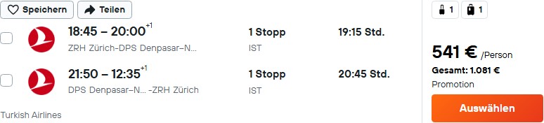 Ebenfalls sehr günstig ist Zürich. Von hier könnt ihr ab 541€ mit Turkish Airlines nach Bali fliegen. Aufgabegepäck ist in dem Fall auch schon dabei und ihr müsst nur einmal in Istanbul umsteigen.