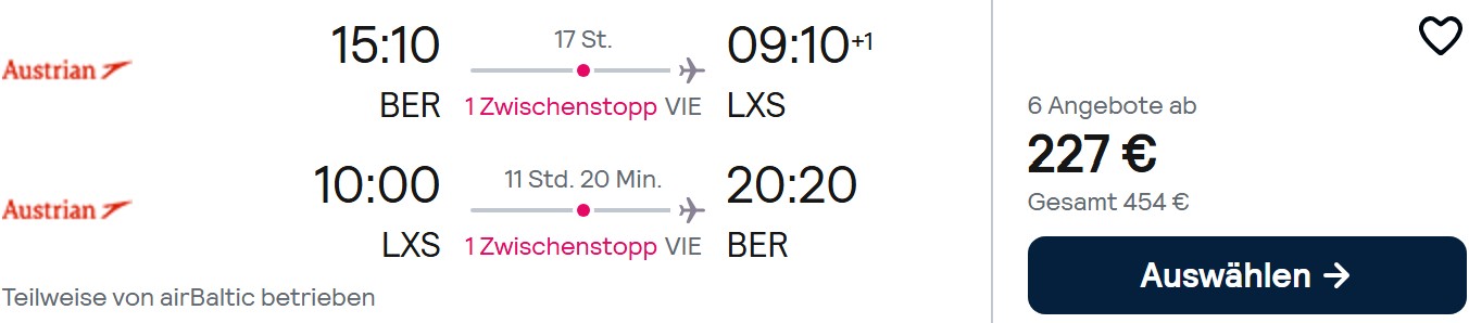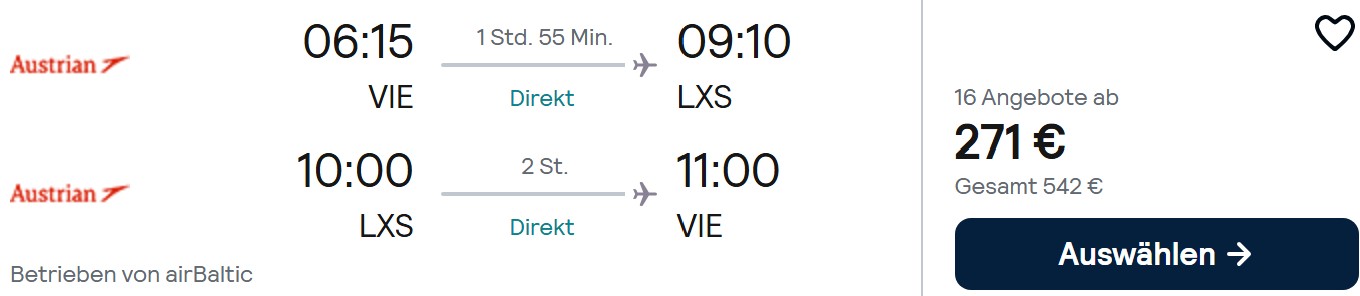 Einen kleinen Haken wollen wir euch nicht verschweigen. Da der Flug von Wien nach Limnos schon kurz nach 6 Uhr morgens geht, findet ihr natürlich keinen passenden Zubringer, sondern müsst am Vortag nach Wien. Achtet also bei der Eingabe eurer Wunschtermine darauf, den Hinflug auf einen Samstag zu legen.