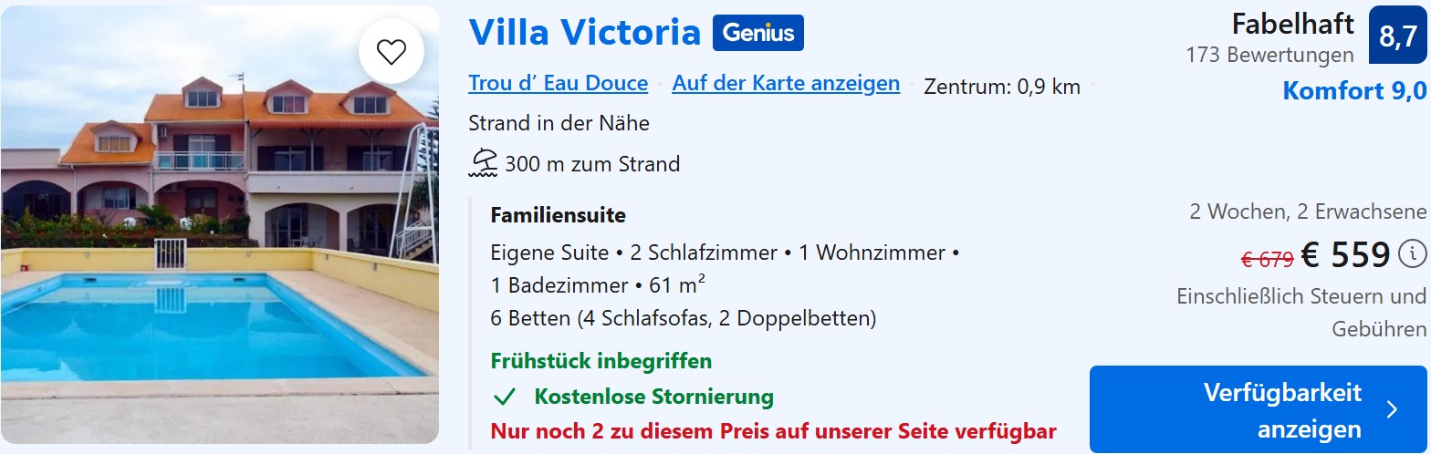 Natürlich haben wir für euch passend zu den Flügen auch Hotelempfehlungen. Das Gästehaus Villa Victoria in Trou d’Eau Douce ist mit unter 40€ pro Nacht sehr günstig, zumal das Frühstück im Preis schon drin ist und es auch einen Pool gibt. In der Umgebung findet ihr unzählige Restaurants, Cafés und Bars, aber auch jede Menge Shops. Eine gute Alternative, aber auch etwas teurer, ist das Bed & Breakfast Chez Cozy’s.