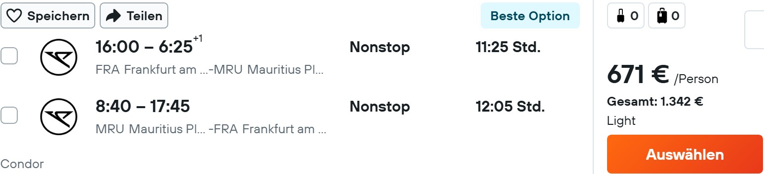 Auch der Konkurrent Condor hat vergleichbare Preise. Hier ist allerdings im günstigsten Tarif ab 671€ noch gar kein nennenswertes Gepäck dabei. Mindestens 750€ müsst ihr für den nächst höheren Tarif zahlen, bei dem dann alles wie gewohnt enthalten ist.