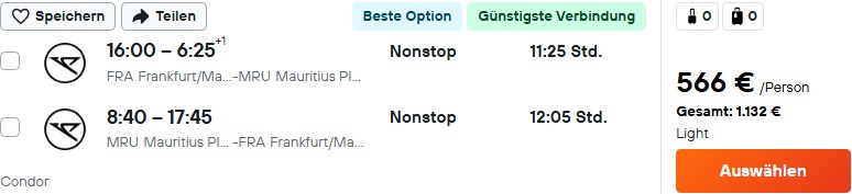 Update: Im Dezember könnt ihr jetzt auch bei Condor günstige Flüge ab 566€ nonstop nach Mauritius buchen. Nennenswertes Gepäck ist im günstigsten Tarif leider auch hier noch nicht dabei und die Aufpreise sind deutlich höher als bei Lufthansa. Deshalb lohnt fast immer, den nächst höheren Tarif ab 660€ auszuwählen, bei dem dann wie üblich ein Kabinentrolley und 20kg Freigepäck enthalten sind.