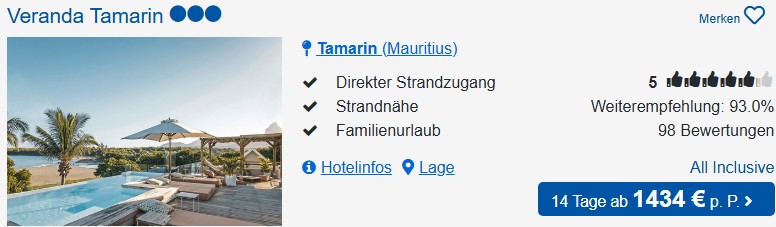Die Auswahl an All Inclusive-Hotels auf Mauritius ist vergleichsweise groß. Den besten Preis bekommt ihr im Beispielzeitraum der Flüge im Laguna Beach Hotel. Das Veranda Tamarin Resort ist eine gute Alternative und nur wenige Euro teurer.