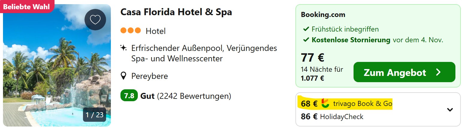 Für nur 899€ pro Person bekommt ihr nämlich nicht nur die Flüge, sondern auch schon 14 Übernachtungen in einem sehr gut bewerteten Gästehaus mit Frühstück nicht weit vom Strand. Ein All Inclusive-Resort ist etwa 1.000€ teurer.