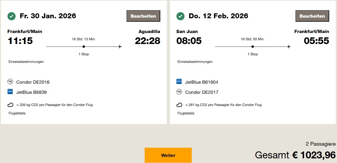 Immerhin gibt es momentan einen Lichtblick. Da Condor das Netzwerk ihrer USA-Flüge sukzessive ausbaut und mit jetBlue an der Ostküste einen passenden Kooperationspartner gefunden hat, könnt ihr durchgehende Flugtickets mit einem Umstieg in New York nach San Juan oder Aguadilla im Westen Puerto Ricos buchen. Und das aktuell schon ab 450€.