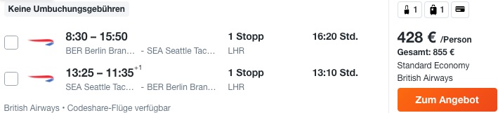 Bis in den Sommer 2022 hinein könnt ihr aktuell Flüge mit British Airways nach Seattle schon für etwas über 300€ buchen. Mögliche Abflughäfen sind neben Berlin auch Düsseldorf, Frankfurt, Hamburg, Hannover, München und Stuttgart für einen kleine Aufpreis.