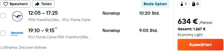Das beste Preis-Leistungsverhältnis gibt es derzeit bei der Lufthansa-Gruppe einschließlich der Töchter Discover, Swiss und Edelweiss. So könnt ihr beispielsweise Flüge von Berlin nach Punta Cana schon für 590€ buchen. Nonstop von Frankfurt beginnen die Preise in der Hauptsaison bei 634€.