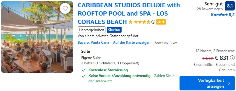 Passend zu diesen Flügen gibt es für euch auch zwei Unterkunftsempfehlungen am Strand von Bavaro. Die Flüge und ein Apartment mit Frühstück sowie Zugang zum Pool und Strand bekommt ihr so für einen 12-tägigen Badeurlaub schon ab 999€ pro Person. Bevorzugt ihr All Inclusive, zahlt ihr ca. 500€ mehr.