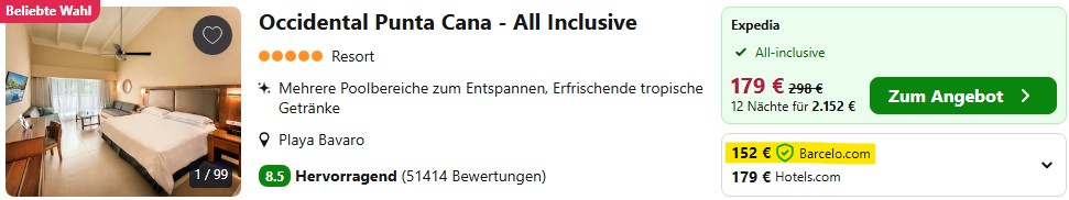 Wenn ihr All Inclusive bevorzugt, könnt ihr recht günstig das Occidental Punta Cana Resort buchen. Mit 152€ pro Nacht, direkter Strandlage, Mahlzeiten und Getränken inklusive ist es sicher das Hotel mit dem insgesamt besten Preis-Leistungsverhältnis.