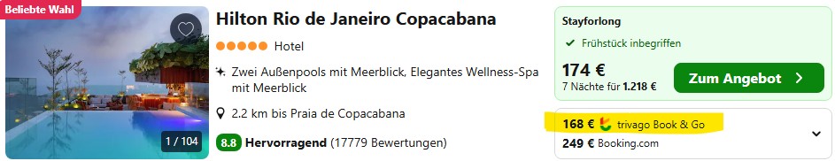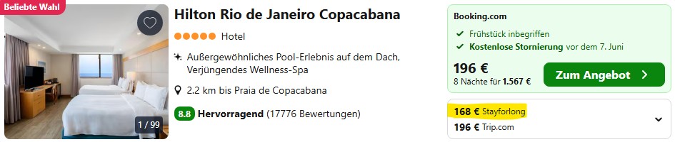 Deutlich teurer aber unter den 5* Hotels das mit dem besten Preis-Leistungsverhältnis ist das Hilton Rio de Janeiro Copacabana. Mit Frühstück kostet euch die Übernachtung hier etwa 168€ für 2 Erwachsene.
