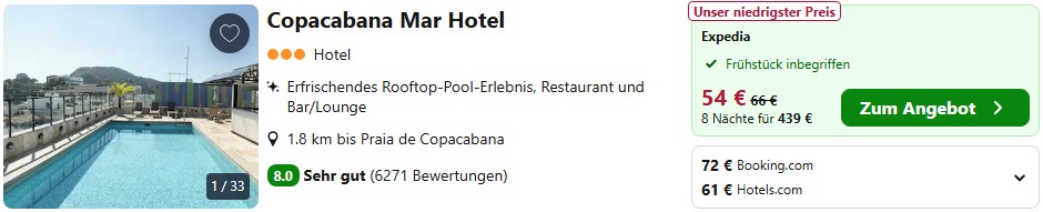 Ans Herz legen können wir euch beispielsweise das 4* Copacabana Mar Hotel. Aufgrund des recht günstigen Preises von 54€ pro Nacht wäre es hier sogar eine Überlegung wert, bereits eine Nacht früher zu reservieren oder zumindest einen früheren Check-in gegen Aufpreis anzufragen, falls ihr wie im Beispiel hier mit dem Nachtflieger am frühen Morgen in Rio ankommt.