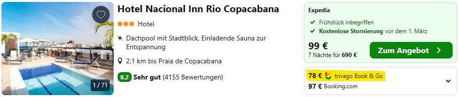 Denn passend zu diesen Flügen haben wir auch ein sehr gut bewertetes Mittelklasse-Hotel mit Rooftop Pool an der Copacabana gefunden, das ihr mit Frühstück für nur 39€ pro Person und Nacht bekommt.