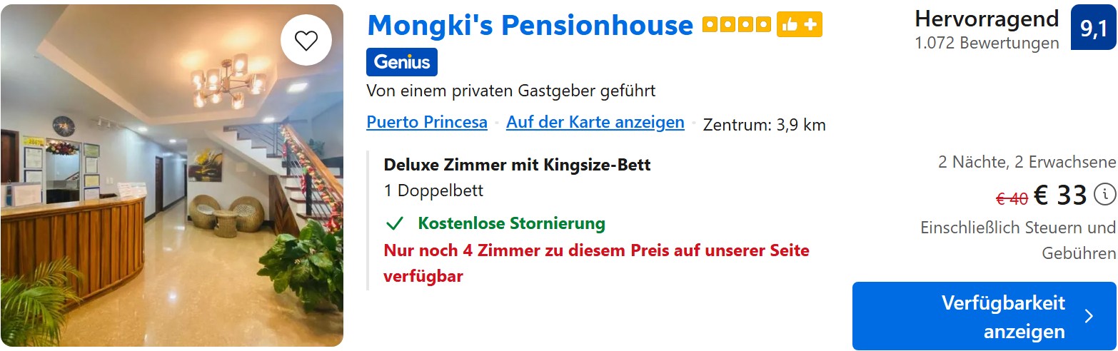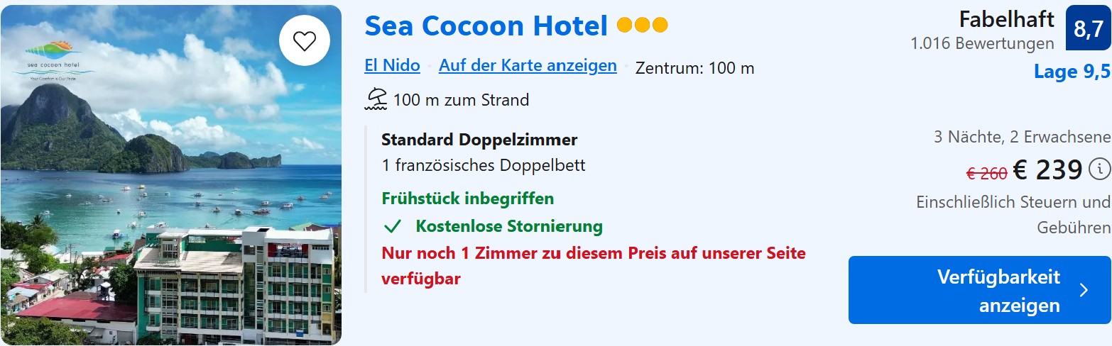 Voraussetzung sind natürlich günstige Flüge nach Manila. Im Bereich 500 bis 700 Euro gibt es aber eine ganze Reihe Optionen und Termine. Für den Rest findet ihr hier zur Inspiration bzw. als Planungsgrundlage unsere Beispielreise für 23 Tage. Mit allen notwendigen Inlandsflügen und unseren Hotelempfehlungen kommt ihr auf 869€ pro Person zu zweit.