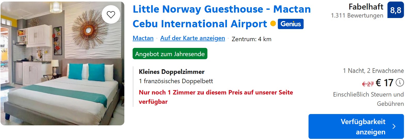 In Cebu herrscht Verkehrschaos, weswegen wir immer empfehlen, eine Nacht vor dem Abflug dort einzuplanen. Im einfachsten Fall sucht ihr euch dafür eine Unterkunft direkt auf Mactan Island, wo auch der Flughafen ist.