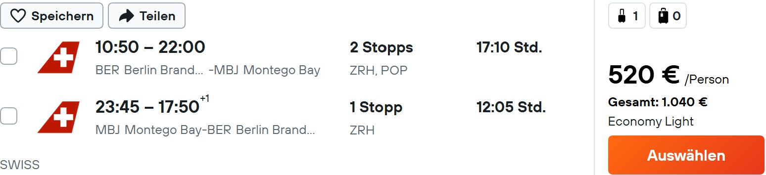 Die aktuell günstigsten Flüge nach Jamaika findet ihr bei der Lufthansa-Gruppe, insbesondere bei den Schweizer Töchtern Swiss und dem Ferienflieger Edelweiss. Mit Zubringer von verschiedenen Airports im deutschsprachigen Raum geht es bestenfalls etwas über 500€ nach Montego Bay und zurück.