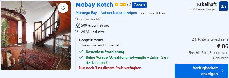 Wir haben passende Flüge schon für 645€ gefunden und euch Empfehlungen für die Unterkünfte entlang der Route ergänzt. So kommt ihr bei 2 Wochen auf einen Gesamtpreis von nur 955€ pro Person bei 2 Erwachsenen. Infos, Fahrpläne und Hinweise zu den öffentlichen Bussen auf Jamaika findet ihr unten im Artikel.