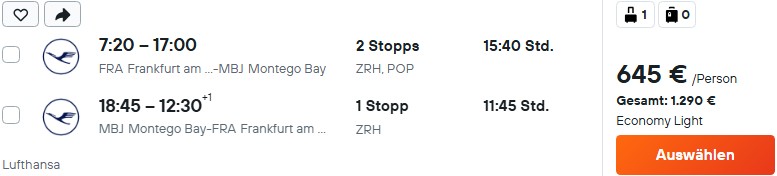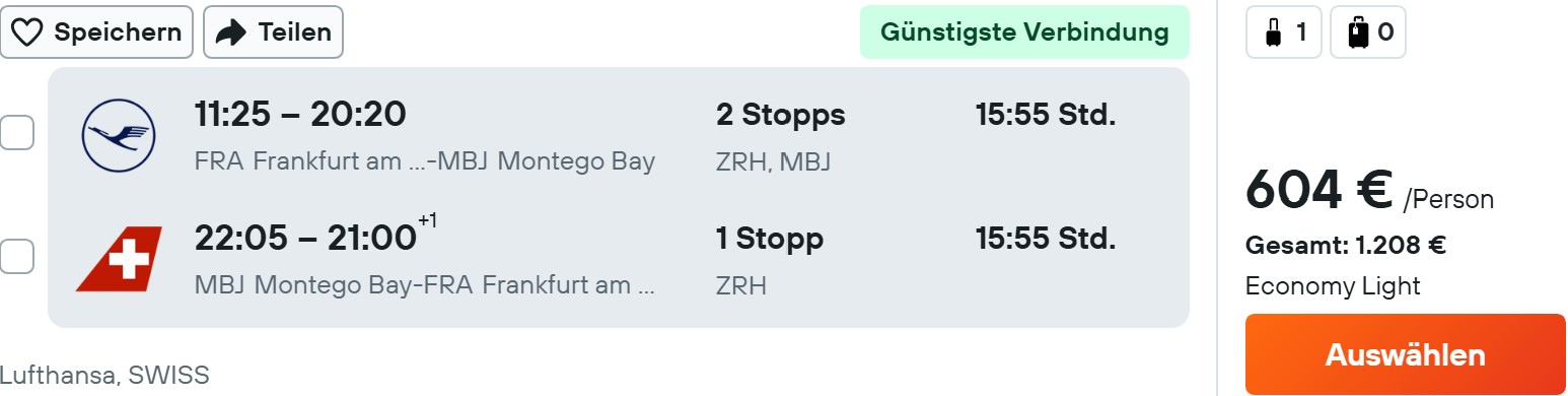 Die aktuell günstigsten Flüge nach Jamaika findet ihr bei der Lufthansa-Gruppe, insbesondere bei den Schweizer Töchtern Swiss und dem Ferienflieger Edelweiss. Mit Zubringer von verschiedenen Airports im deutschsprachigen Raum geht es bestenfalls für 645€ nach Montego Bay und zurück.