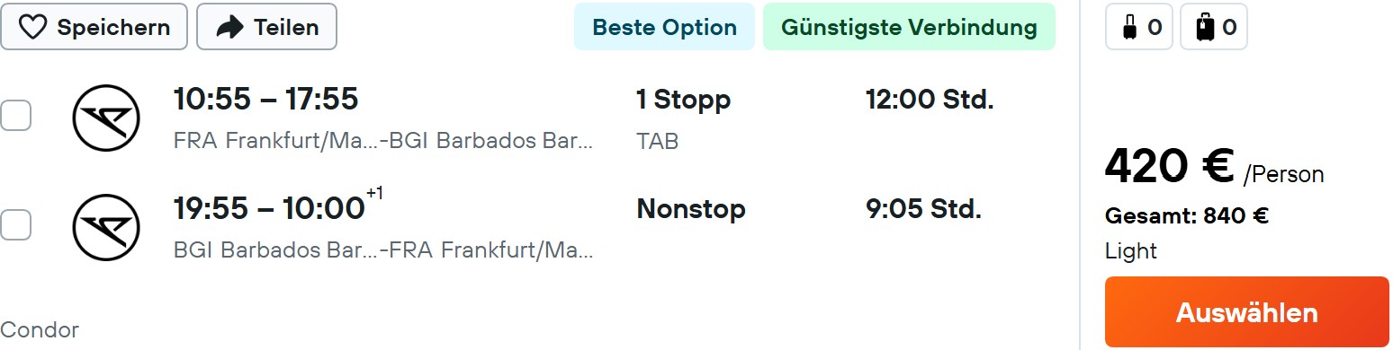 Condor fliegt auch diesen Winter wieder jeden Dienstag direkt von Frankfurt nach Barbados, hinzu mit kurzem Stopp auf Tobago. Die Preise gehen schon bei 420€ los, wobei in diesem Light-Tarif noch kein nennenswertes Gepäck enthalten ist.