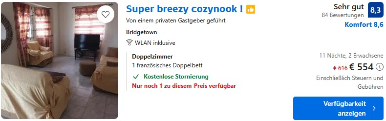 Die Auswahl an kleinen, günstigen Gästehäusern, Hotels und Apartments in Strandnähe ist auf Barbados äußerst begrenzt. Deswegen solltet ihr Unterkünfte wie unser Beispiel so früh wie möglich buchen.