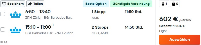 KLM fliegt zweimal pro Woche von Amsterdam direkt nach Barbados, teilweise mit kurzem Stopp in Guyana. Mit Anschluss aus dem deutschsprachigen Raum kommt ihr auf Preise ab 580€ inklusive Kabinentrolley und kleinem Handgepäck.