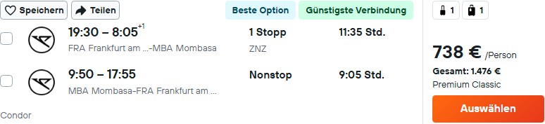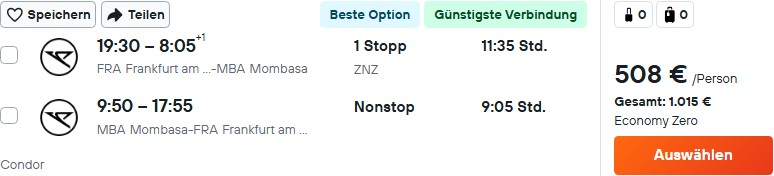 Momentan könnt ihr äußerst günstige Direktflüge mit Condor von Frankfurt nach Kenia (Mombasa) buchen. Los geht es aktuell schon ab 508€ im Zero-Tarif, der das Aufgabegepäck noch nicht enthält. Dieses könnt ihr einzeln hinzu buchen, wählt direkt bei Condor den Standard-Tarif ab 630€ aus oder nehmt einen Veranstaltertarif ab 598€, der ebenfalls Gepäck enthält.