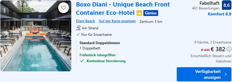 Ein zu den Flügen perfekt passendes Hotel ist das Boxo Diani am Diani Beach. Mit Frühstück zahlt ihr hier für ein Doppelzimmer weniger als 200€ pro Person zu zweit für 9 Nächte. Die Bewertungen sind ausgezeichnet und den Strand erreicht ihr in wenigen Schritten.