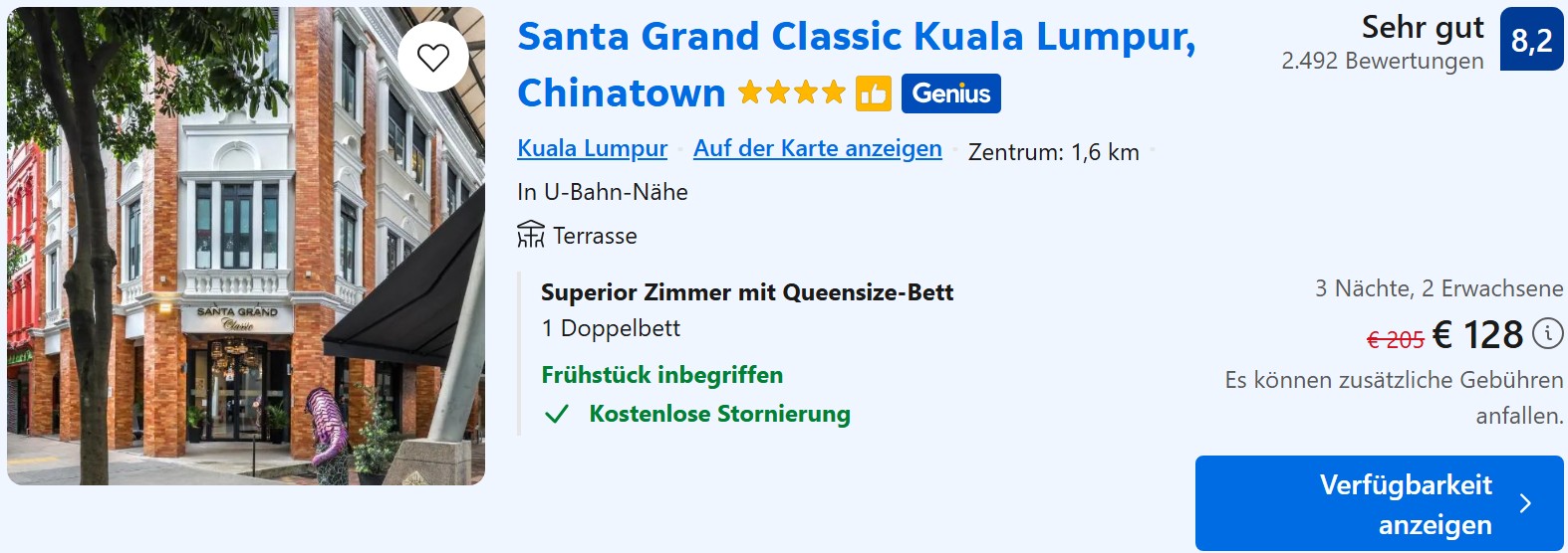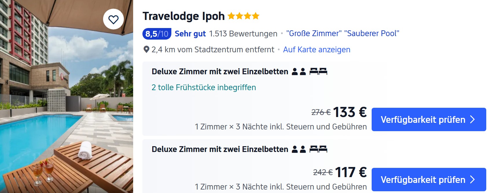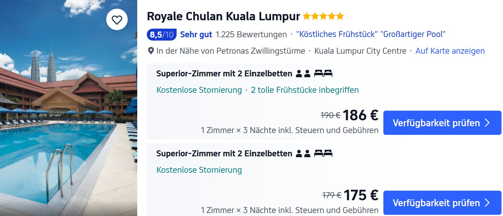 In Kuala Lumpur gibt es eine ganze Reihe von 4* Hotels im Stadtzentrum, die ihr für etwa 60 Euro pro Nacht mit Frühstück buchen könnt. Ein Pool ist in der Preisklasse im Normalfall auch enthalten. Hotels internationaler Ketten sind in der Regel teurer.