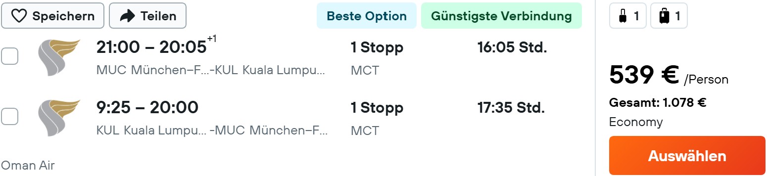 Beachten müsst ihr, dass Etihad und Oman Air neuerdings auf vielen Strecken wie auch hier nach Kuala Lumpur einen Basic-Tarif nur mit Handgepäck anbietet. Anders als bei Lufthansa & Co. kostet der nächst höhere Tarif aber nur 10 bis 15 Euro mehr. In der Praxis ist das natürlich völlig sinnfrei und führt dazu, dass Vergleichsseiten wie Kayak oder Skyscanner trotz Filter nicht immer 100% korrekt sind.